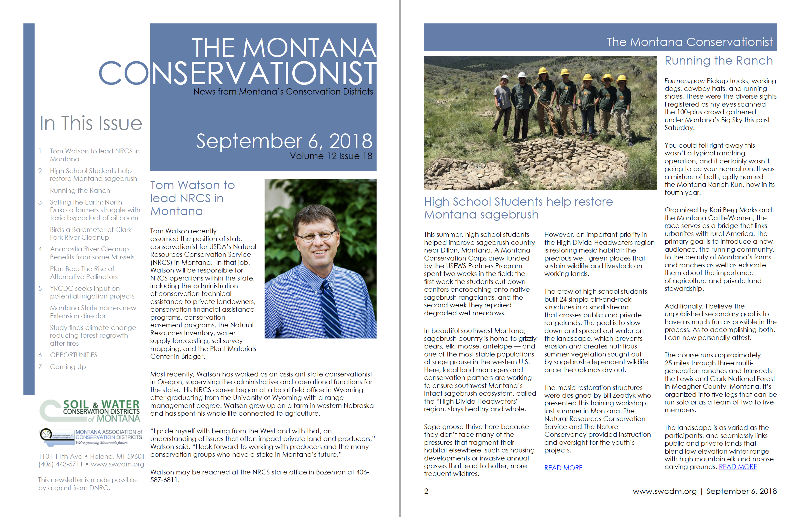 - NRCS has appointed a new State Conservationist. Tom Watson, formerly the assistant state conservationist in Oregon, will be leading the agency in Montana.